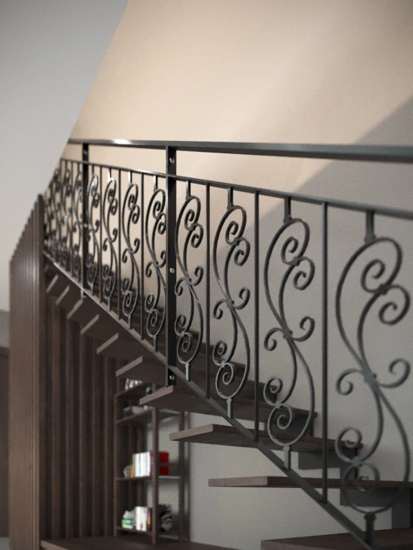 Rambarde escalier Volute en fer forgé brut sans peinture. Ornée de motifs à volute, cette balustrade escalier élégante apportera de l’esthétisme à vos escaliers et ce en intérieur comme à l’extérieur.